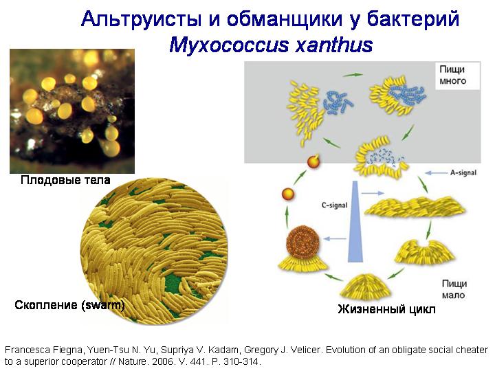 При недостатке пищи миксококки образуют плодовые тела, в которых часть бактерий превращается в споры. В виде спор микробы могут пережить голодные времена. Плодовое тело «собирается» из множества индивидуальных бактерий. При этом лишь часть бактерий получает прямую выгоду, а остальные жертвуют собой ради общего блага. Дело в том, что не все участники коллективного действа могут превратиться в споры и передать свои гены следующим поколениям. Многие особи выступают в роли «стройматериала», обреченного умереть, не оставив потомства.
