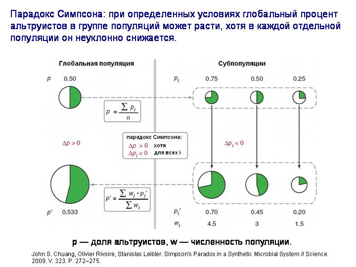 В результате может возникнуть ситуация, которая интуитивно кажется невозможной: в каждой отдельной популяции процент носителей «генов альтруизма» неуклонно снижается (то есть альтруисты всегда проигрывают в конкуренции своим эгоистичным сородичам), но если мы рассмотрим все популяции в целом, то окажется, что в глобальном масштабе процент альтруистов растет. Принцип действия «парадокса Симпсона» показан на слайде.