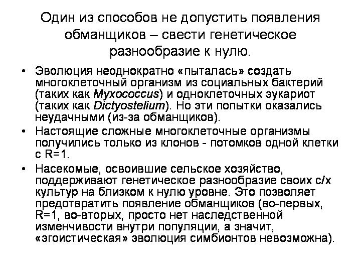 Для этого нужно свести генетическое разнообразие особей в системе к полному нулю (чтобы R=1). Тогда симбионты просто не смогут конкурировать друг с другом за то, кто из них ухватит себе больший кусок общего пирога. Если все симбионты генетически идентичны, эгоистическая эволюция внутри системы становится невозможной, потому что из минимального набора условий, необходимых для эволюции, — дарвиновской триады «наследственность, изменчивость, отбор», исключается один из компонентов, а именно изменчивость.