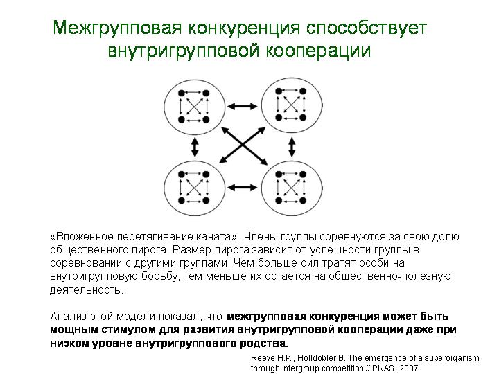 Исследование этой модели показало, что конкуренция между группами должна быть сильнейшим стимулом для развития внутригрупповой кооперации – даже при низком уровне внутригруппового родства.