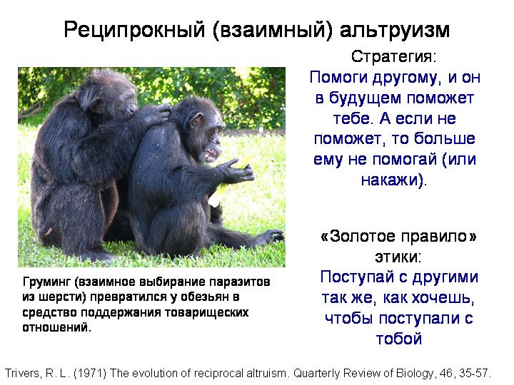 Реципрокный альтруизм дорог сердцу приматов вида Homo sapiens, иначе они не назвали бы «золотым правилом этики» инструкцию, содержание которой отчетливо перекликается с идеалом реципрокности: «Поступай с другими так же, как хочешь, чтобы поступали с тобой».