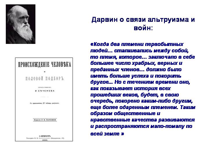 Важную роль в эволюционном развитии альтруизма у наших предков могли сыграть войны. Идею о связи межгрупповых конфликтов с эволюцией альтруизма высказал еще Дарвин в книге «Происхождение человека и половой отбор», где он написал следующее: «Когда два племени первобытных людей сталкивались между собой, то племя, которое заключало в себе большее число храбрых, верных и преданных членов, должно было иметь больше успеха и покорить другое... Но с течением времени оно, как показывает история всех прошедших веков, будет, в свою очередь, покорено каким-либо другим, еще более одаренным племенем. Таким образом общественные и нравственные качества развиваются и распространяются мало-помалу по всей земле».