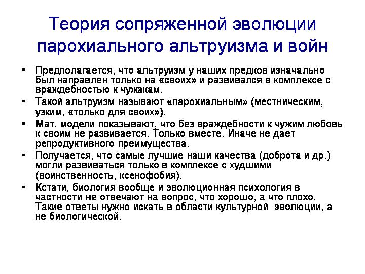 Старая идея о связи межгрупповых конфликтов с эволюцией нравственности активно развивается в последние годы (правда, в несколько ином ключе) в рамках новой теории «сопряженной эволюции парохиального альтруизма и войн» (Choi, Bowles, 2007). Предполагается, что альтруизм у наших предков изначально был направлен только на членов своей группы. Такой альтруизм называют парохиальным, то есть местническим, узким, «только для своих». При помощи математических моделей было показано, что альтруизм мог развиваться только в комплексе с враждебностью к чужакам. Получается, что такие, казалось бы, противоположные свойства человека, как доброта и воинственность (ксенофобия), развивались в едином комплексе: ни та, ни другая из этих черт по отдельности не способствовали бы репродуктивному успеху их обладателей.