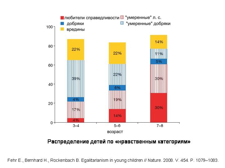 Выяснилось, что большинство трех- и четырехлетних детей ведут себя как абсолютные эгоисты. Однако к 7–8 годам уже четко выражена готовность помочь ближнему. При этом специальные тесты показали, что это поведение основано не на бескорыстном желании помочь, а на стремлении к равенству и справедливости. Например, дети склонны отвергать нечестные, неравные варианты раздела конфет как в свою, так и в чужую пользу. Доля «любителей справедливости» среди детей быстро растет с возрастом.