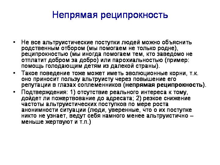 Такой механизм мотивации альтруистических поступков называют «непрямой реципрокностью». Выигрыш в данном случае достигается не за счет прямой отдачи по принципу «ты мне, я тебе», как при обычной реципрокности, а за счет демонстрации собственных качеств, ценимых особями противоположного пола и обществом в целом. В данном случае демонстрируются доброта, щедрость и материальная обеспеченность.