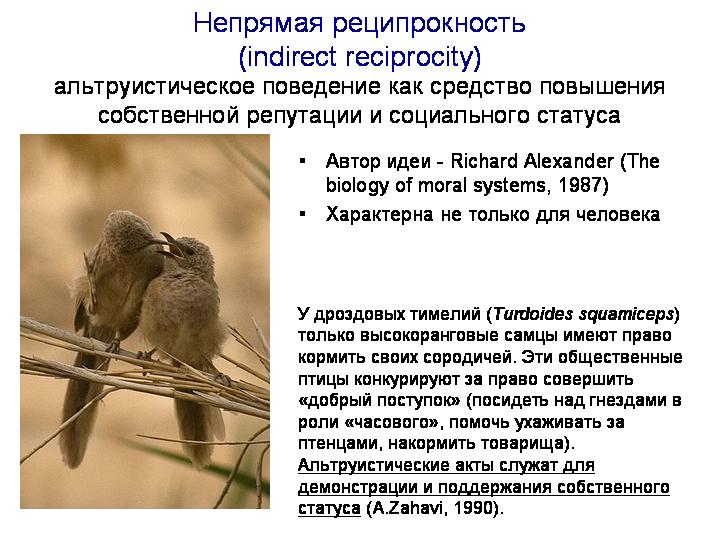 Непрямая реципрокность встречается не только у людей, но и у других животных. Яркий пример – арабские дроздовые тимелии (Turdoides squamiceps), птицы, ведущие общественный образ жизни. Только высокоранговые самцы тимелий имеют право кормить своих сородичей. Если низкоранговый самец попробует угостить кого-то, стоящего выше него в общественной иерархии, он рискует получить взбучку. Самцы всерьез конкурируют за право совершить «добрый поступок»: посидеть над гнездами в роли часового, помочь самкам ухаживать за птенцами, накормить товарища. Альтруистические акты приобрели у них отчасти символическое значение и служат для демонстрации и поддержания собственного статуса (Zahavi, 1990).