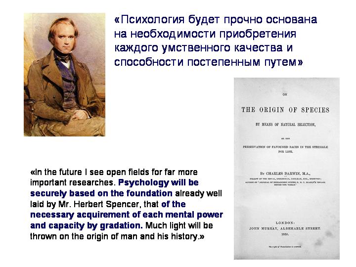 В заключительной главе «Происхождения видов» есть примечательная фраза. «В будущем, я предвижу, откроется еще новое важное поле исследования. Психология будет прочно основана (...) на необходимости приобретения каждого умственного качества и способности постепенным путем». Здесь Дарвин фактически предсказал развитие такой дисциплины, как эволюционная психология. А предсказания Дарвина имеют обыкновение сбываться.