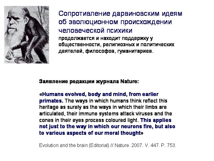 Тем не менее эволюционный подход все-таки становится доминирующим. Но ученым, работающим в этом направлении, приходится отстаивать свои позиции от всевозможных нападок, и отголоски этой борьбы проникают даже на страницы уважаемых научных журналов. Вот, например, какое заявление недавно пришлось сделать редакции журнала Nature в ответ на антиэволюционные выступления американских политиков: «и тело, и разум человека произошли путем эволюции от более ранних приматов. Способ человеческого мышления свидетельствует о таком происхождении столь же убедительно, как и строение и работа конечностей, иммунной системы или колбочек глаза. Это относится не только к механизму работы нейронов, но и к различным аспектам нашей морали» (Evolution and the brain (Editorial) // Nature. 2007. V. 447. P. 753).