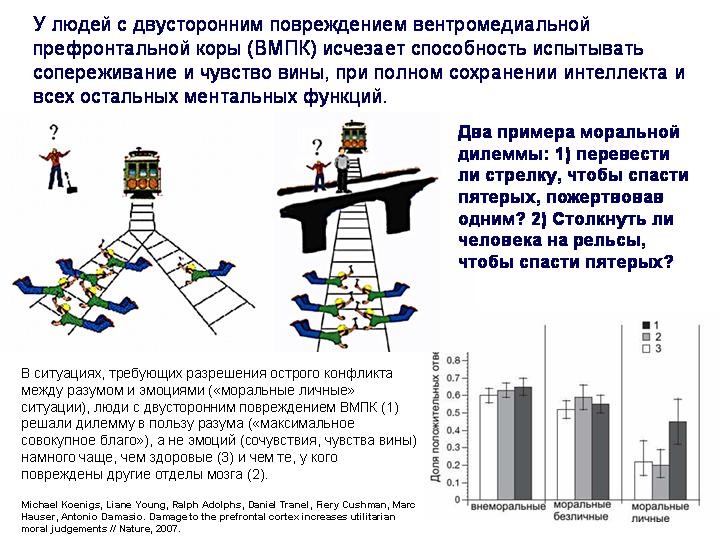 Быстро накапливаются факты, говорящие о том, что даже «высшие» проявления нашей психики имеют материальную основу. Например, выявляются конкретные области мозга, отвечающие за те или иные аспекты наших моральных суждений. Например, обнаружилось, что у людей с повреждением определенного участка мозга (вентромедиальной префронтальной коры) исчезает способность испытывать сопереживание и чувство вины, при полном сохранении интеллекта и всех остальных функций мозга. Такие люди на сознательном уровне прекрасно отличают добро от зла, но на практике отсутствие эмоциональной составляющей в механизме формирования моральных суждений приводит к характерным искажениям, отклонениям в работе этого механизма. Такие люди выносят моральные суждения только на основе холодного расчета: какой из двух вариантов в итоге даст максимум пользы и минимум вреда. Здоровые люди учитывают еще и свои эмоции (рассказать по слайду).