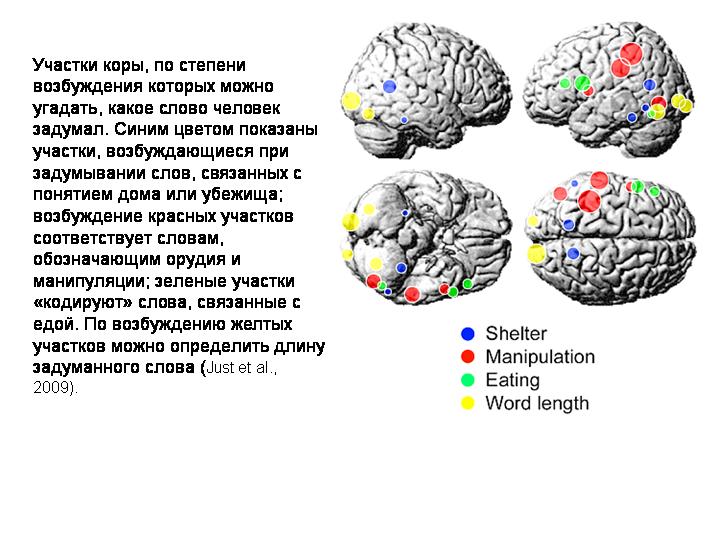 Мысли об определенных понятиях локализуются в определенных участках мозга. И поэтому можно, следя за работой мозга при помощи фМРТ, определить, что человек, например, сейчас думает о чем-то, связанном с идеей жилища, или с идеей орудий, инструментов, или он сейчас думает о еде. Такие эксперименты реально уже проводятся и дают положительные результаты. То есть мысли имеют вполне материальную основу, и их можно считывать с томограмм.