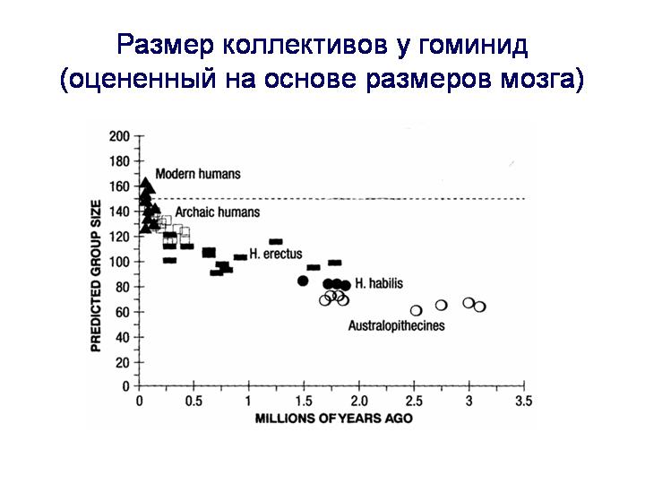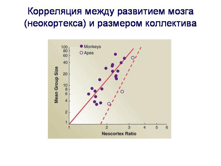 Характер этой корреляции таков, что можно рассчитать, какой максимальный размер группы мог быть у наших предков. Для современного человека получается, что максимальный размер группы – 150 человек. В такой группе мы способны поддерживать индивидуальные отношения с каждым членом группы, знать его репутацию и так далее. (однако нет оснований полагать, что в ходе антропогенеза шло постоянное увеличения размера групп. Возможно, личные взаимоотношения становились более сложными и/или росла способность налаживать межгрупповую кооперацию).