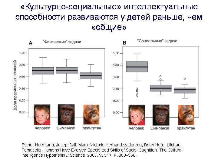 Каким образом появились у людей эти способности? На этот счет предложены две гипотезы. Либо они возникли в результате равномерного развития интеллекта в целом, либо это было специфическое, узконаправленное развитие именно социально-ориентированных способностей, а все прочие способности (например, к выявлению причинно-следственных связей в физическом мире) развились позже, как нечто дополнительное, вторичное. Некоторые данные свидетельствуют в пользу второй версии. Например, показано, что дети в возрасте двух с половиной лет справляются с задачами «социального» характера гораздо лучше обезьян, хотя в решении «физических» задач шимпанзе и орангутаны нисколько не уступают им.