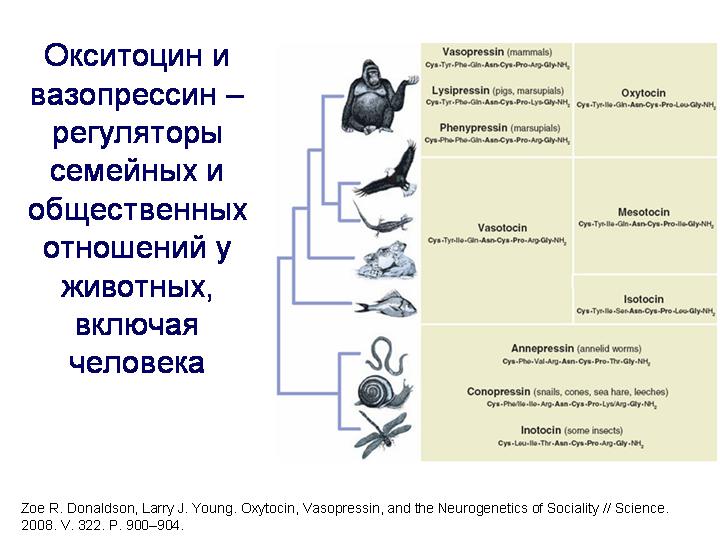 В последние годы много внимания уделяется нейрохимическим основам социального поведения и межличностных отношений. Оказалось, что у человека и других животных работают одни и те же системы регуляции этих сложнейших форм поведения. Речь идет, в частности, о роли нейропептидов окситоцина и вазопрессина в регуляции семейных и общественных отношений. Мало того, что сами эти нейропептиды практически одинаковы у разных животных, так они еще и действуют очень похоже.