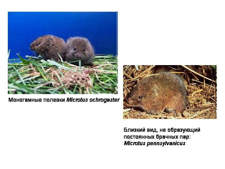 Есть такой замечательный объект для изучения нейрохимии семейных отношений – американские полевки. Среди них есть моногамный вид, для которого характерно образование постоянных брачных пар. Самцы этого вида привязываются к своей избраннице на всю жизнь и активно участвуют в заботе о потомстве. Самки тоже на всю жизнь привязываются к своему супругу. А у близких видов того же рода нет постоянных пар, и самцы не заботятся о детенышах.