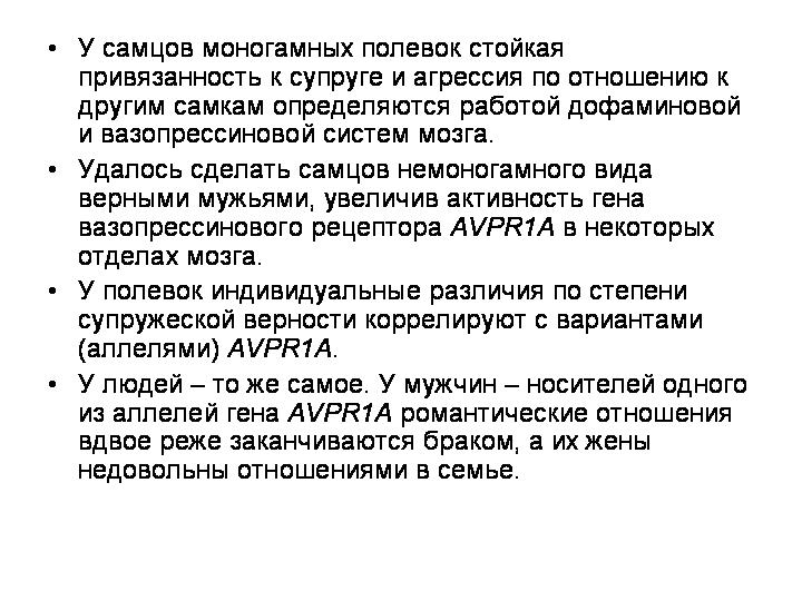 И вот оказалось, что воздействуя на активность генов рецепторов вазопрессина в мозге самца немоногамной полевки, все-таки можно научить его быть верным мужем, то есть создать поведение, не свойственное данному виду.
