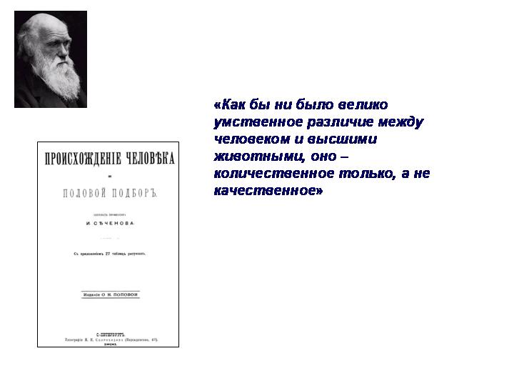 Дарвин в своих трудах иногда настолько опережал свое время, что просто диву даешься. Например, в книге «Происхождение человека и половой отбор» он прямо пишет о том, что различия между мышлением человека и животных имеют не столько качественный, сколько количественный характер. Мысль крамольная даже по нынешним временам, а тем более в 19 веке.