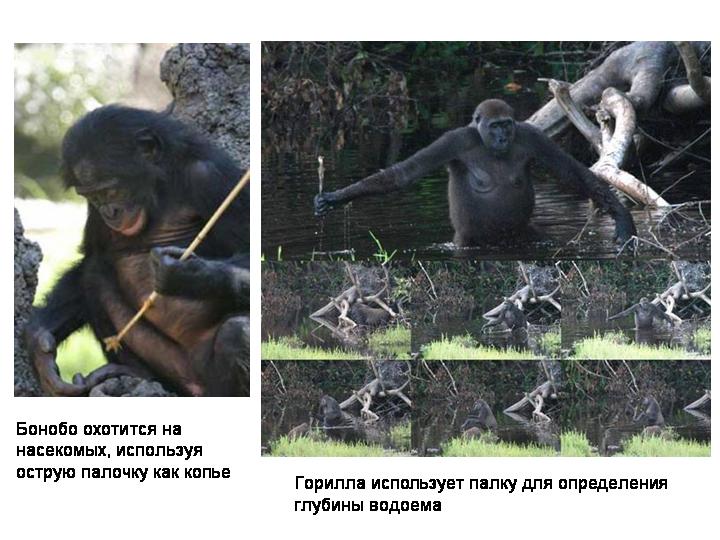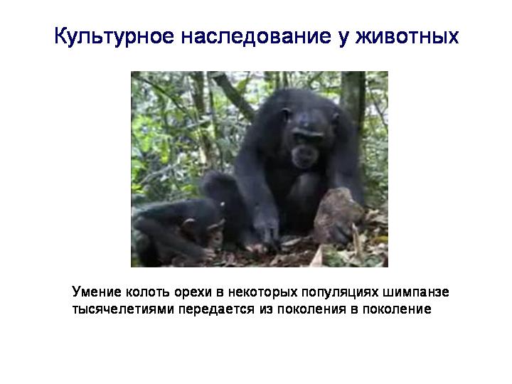 Есть у животных и культурное наследование – например, умение колоть орехи камнями передается из поколение в поколение в некоторых популяциях шимпанзе, причем в разных популяциях существуют разные традиционные методы колки орехов. И эти традиции передаются и сохраняются в популяциях шимпанзе тысячелетиями. И колка орехов – это не врожденное поведение, ему обучаются в первые годы жизни, причем обучаются долго и с большим трудом.