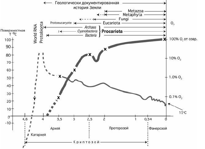Совокупность палеонтологических и молекулярно-биохимических данных, последних двух десятилетий, позволяет наметить последовательность появления организмов разного уровня организации в истории биосферы Земли: бактерии (s.l.) – не позднее 3,8 Ga; цианобактерии – 3,5 Ga (Walsh, 1992; Shopf, 1993); эвкариоты – 3,0-2,7 Ga (Тимофеев, 1982; Brooks etal, 1989); грибы –2,4-2,2 Ga (Валенчак, Розанов, 1986); метафита – 2,2-1,9 Ga (Тимофеев, 1982; Hun, Runnigar, 1992); метазоа – 1,8-1,5 Ga (Саютина, Вильмова, 1990; Yockelson, Fedonkin, 2000); целомата –1,4-1,0 Ga (Гниловская, 1998; Weigou и др. 1999). Такая последовательность требует эволюции соответствующих температурных, кислородных и иных параметров. Похоже, что около 3-х млрд. лет тому назад кислорода должно было быть не менее нескольких процентов от сегодняшнего уровня. В промежутке между 3,5 Ga и современностью общее падение средних поверхностных температур Земли составило не более 40 °С. Время существование мира РНК наиболее правдоподобно относится к какой-то части интервала 4,6-3,90, если мы верим в земное его происхождение. Конечным итогом развития мира РНК могло быть образование протобионтов, а затем и протоклеток на локальных участках остывающих лав в очагах развития К-содержащих глин типа селадонита.