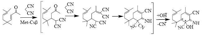 Для проверки этого предположения нами была осуществлена модификация оснoвного цеолита Csβ природной оптически активной аминокислотой L-метионином. Полученный хиральный катализатор Met-Csβ оказался достаточно эффективным катализатором реакций целого набора различных ахиральных соединений (бензальацетона, ряда α,β-ненасыщенных карбонильных соединений терпеноидного ряда) с малононитрилом. Все образующиеся в этих реакциях продукты, имеющие асимметрические центры, обладали оптической активностью. Необходимо отметить, что даже в случае протекания многостадийных тандемных превращений нами был синтезирован оптически активный продукт.
