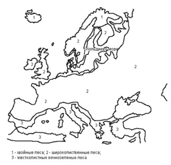 Рис. 2. Межледниковый период: 1 — хвойные леса; 2– широколиственные леса; 3 — жестколистные вечнозеленые леса