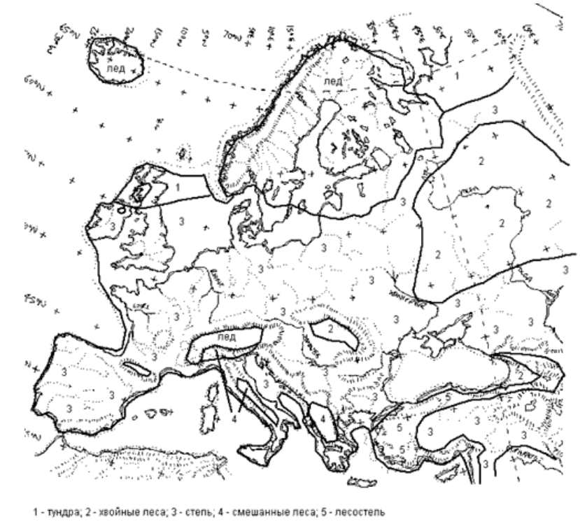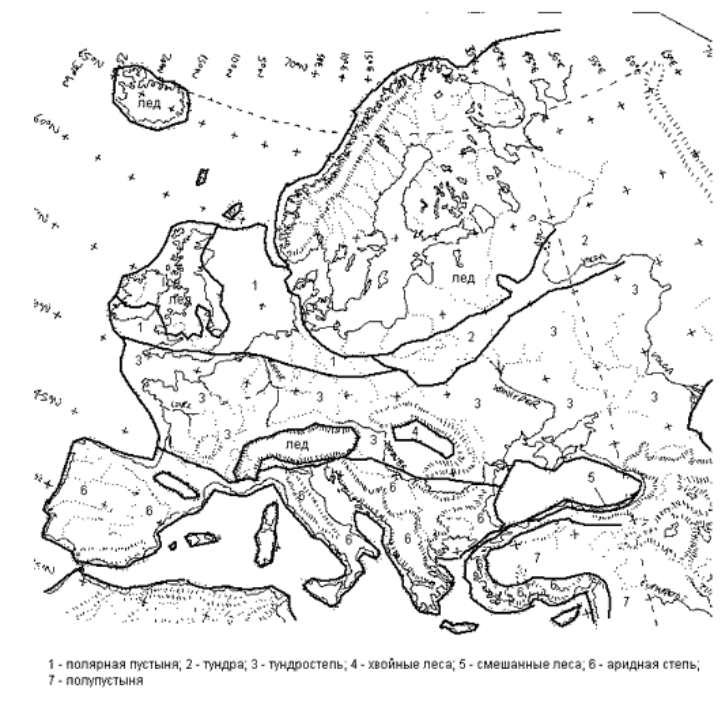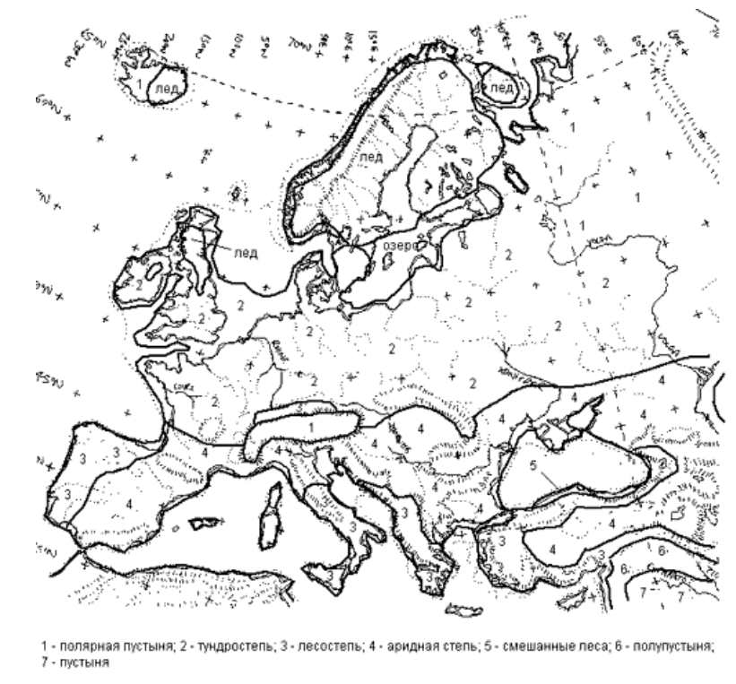 Рис. 3. Последнее оледенение: 1 — полярная пустыня; 2 — тундра; 3 — тундростепь; 4 — хвойные леса; 5 — смешанные леса; 6 — аридная степь; 7 — полупустыня