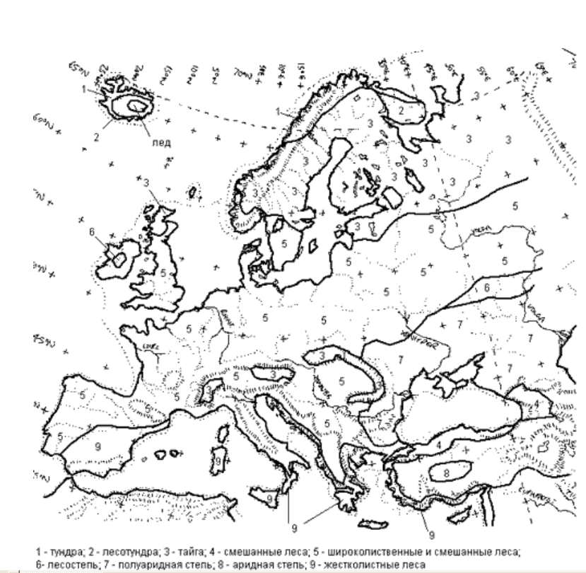 Рис. 6. Наиболее теплый и влажный период в голоцене: 1 — тундра; 2 — лесотундра; 3 — тайга; 4 — смешанные леса; 5 — широколиственные и смешанные леса; 6 — лесостепь; 7 — полуаридная степь; 8 — аридная степь; 9 — жестколистные леса
