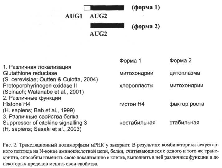 Второй способ роста сложности генных сетей — увеличение числа уровней иерархии их регуляции. Так, если у прокариот регуляция экспрессии генов идет в основном лишь на уровне транскрипции и трансляции, то у эвкариот только между ними вклинились 1) регуляция на уровне нуклеосом (Kornberg, Lorch, 1999; Levitsky et al., 2001): 2) модификации белков хроматина (Mahmoudi, Verrijzer, 2001; Narlikar et al., 2002), 3) транспорта РНК (Cremer, Cremer, 2001), 4) сплайсинга и 5) процессинга РНК (Black, 2000; Graveley, 2001) и 6) пространственного распределения хромосом в ядре (Стегний, 1991; Cremer, Cremer, 2001). Причем на каждом из этих уровней возможна своя комбинаторика. Например, комбинаторика экзонов и интронов в ходе альтернативного сплайсинга гена DSCAM дрозофилы, участвующего в формировании нервной системы, позволяет получить с одной пре-мРНК десятки тысяч вариантов белка (Black, 2000). На уровне трансляции комбинаторика альтернативных стартов трансляции, обеспечивающая разнообразие вариантов мРНК, отличающихся структурой первого интрона позволяет модифицировать характеристики белков, получаемых с одного транскрипта (Bab et al., 1999, Watanabe et al., 2001; Outten, Culotta, 2004) (рис. 2). Таким образом, с ростом числа уровней регуляции сложность генных сетей растет экспоненциально!