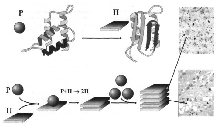 Рис. 5. Механизм развития прионных «медленных инфекций» (по Prasiner, 1996a,b). Молекула прионного белока может принимать две конформации — растворимую глобулярную (Р) и патогенную (П), способную вызывает цепную реакцию смены конформации у глобулярных подобных ей молекул, что ведет к образованию миелоидных тяжей и бляшек в тканях головного и спинного мозга (фото справа).