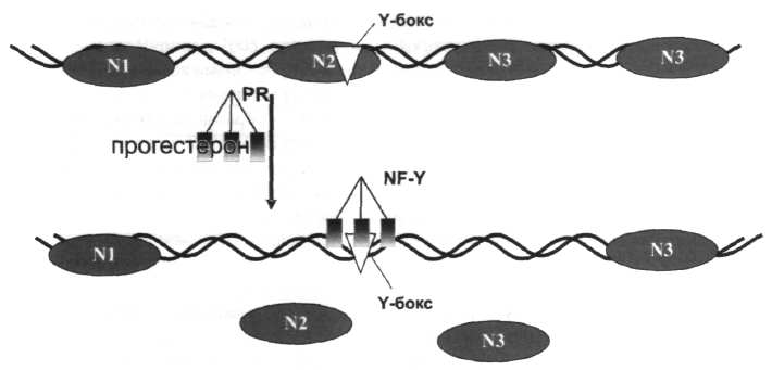 Рис. 6. Комбинаторные механизмы регуляции транскрипции генов эукариот: нуклеосомная упаковка ДНК. Статус хроматина определяется состоянием клетки и может меняться в ходе ее функционирования. В области энхансера гена утероглобина в клетках слизистой оболочки матки кролика, в репрессированном состоянии расположен массив нуклеосом (N...), препятствующий связыванию транскрипционных факторов с ДНК. При гормональной индукции прогестероном (PR) нуклеосомный массив разрушается под действием транскрипционного фактора NF-Y и энхансер становится доступен для взаимодействия с другими транскрипционными факторами (по Scholz et al., 1999).