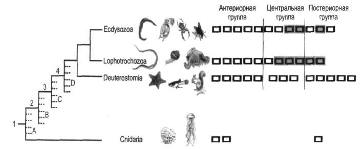 Рис. 8. Эволюция механизмов развития животных. Цифрами обозначены основные ароморфозы, буквами — основные адаптивные радиации, следовавшие за ними (Davidson et al., 1995, Knoll, Carroll, 1999; Peterson et al., 2000): 1) появление генной сети дифференцировки клеток у предков Eumetazoa, A — радиация молекулярных механизмов клеточной дифференцировки ранних многоклеточных; 2) появление генной сети эмбриогенеза с детерминацией бластомеров сразу после оплодотворения (эмбриогенез типа 1, характерный для личинок примитивных первично- и вторичноротых), В — радиация молекулярных механизмов эмбриогенеза ранних билатерий; 3) интеграция генных сетей пролиферации и дифференцировки, давшая клетки, способные к дифференциации в ткани и органы после завершения примитивного эмбриогенеза, С — радиация механизмов взаимодействия генных сетей дифференцировки и регуляции клеточного цикла; 4) появление генных сетей-интеграторов морфогенеза, специализирующих такие клетки (Нох-гены и др.), D — радиация механизмов детерминации структур взрослой формы. Эволюционные взаимоотношения между группами Bilateria реконструированы на основе 18S рРНК (Peterson et al., 2001). Справа от древа — распределение Нох-генов (прямоугольники) у кишечнополостных и трех основных групп билатерий. По сходству аминокислотных последовательностей Нох-гены делят на 3 ортологичные группы — антериорную, центральную и постериорную (разделены на рис. вертикальными линиями). Все 5 генов антериорной группы высококонсервативны. Центральная группа менее консервативна и состоит из 4 генов у первичноротых и 3 генов у вторичноротых. Постериорная группа самая вариабельная и включает до 2 генов у первичноротых и до 3 генов у вторичноротых. Lophotrochozoa и Ecdysozoa имеют 5 и 3 уникальных Нох-гена, соответственно (выделены тенью) (Balavoine et al., 2002).