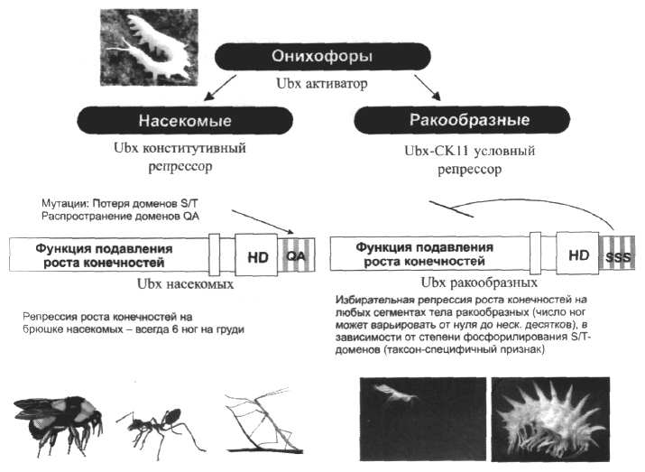 Изучение структуры белка Ubx онихофор, насекомых и ракообразных выявило у ракообразных в его С-концевой области дополнительный регуляторный пептид, богатый серином и треонином, входящими в состав консервативных сайтов фосфорилирования. Фосфорилирование этих остатков киназой CKII меняет репрессорную акивность Ubx по отношению к формированию конечностей (Ronshaugen et al., 2002). Более того, после фосфорилирования эти остатки формируют добавочные сайты для фосфорилирования как CKII, так и киназой GSK9, что повышает гибкость регуляции морфогенеза конечностей у ракообразных (Fiol et al., 1987). Напротив, ни в одном из Ubx белков насекомых С-концевых богатых серином и треонином последовательностей не выявлено, зато удаление С-концевого QA-домена, консервативного у насекомых, снижало эффект репрессии подавления конечностей (Ronshaugen et al., 2002). Таким образом, можно сделать вывод, что в ходе дивергенции артропод, шедшей уже после формирования характерного для Ecdysozoa набора Нох-генов (Grenier et al., 1997) (см. рис. 8) у предков насекомых началась эволюция регуляторных доменов-коре-гуляторов, заставлявших ЦР тотально подавлять развитие конечностей, тогда как у предков ракообразных преимущественное развитие получили домены с активными сайтами (в данном случае — фосфорилирования), позволяющими модулировать активность белка (Ronshaugen et al., 2002).
