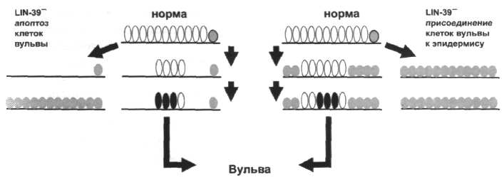 Замечательный пример перепрофилирования генов в позднем эмбриогенезе демонстрируют нематоды. У разошедшихся не более 200 млн. лет назад родов Caenorhabditis и Pristionchus (Lee et al., 2003) ген lin-39 контролирует образование вульвы, активируя совершенно разные генные сети. Одна и та же мутация lin-39 у Caenorhabditis ведет к слиянию клеток вульвы с гиподермальным синцитием, а у Pristionchus к апоптозу клеток вульвы. В обоих случаях формируется один и тот же безвульварный фенотип (Sommer et al., 1998) (рис. 10).