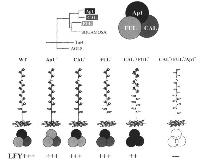 (16 Мутации гена API ведут к частичной стерильности соцветия. Одиночные мутации fill, или cal вообще никак не влияют на цветение (Ferrandiz et al., 2000).)