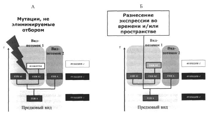 Разнесение во времени и пространстве возможно за счет любого из трех вышеупомянутых типов мутаций, меняющих работу генных сетей. Таким образом, только такие мутации, причем, последовавшие достаточно быстро вслед за образованием паралогов, могут провоцировать прогрессивную эволюцию путем смены функций по Оно. Четвертый тип — перепрофилирование ЦР — сам по себе не снимает проблему псевдогенизации, требуя внешних дополнительных воздействий (эволюция, позволяющая раскрыть потенции преадаптаций). Специфическим перепрофилированием может быть превращение паралога в ген-регулятор, контролирующий второй паралог (например, при считывании киРНК с псевдогена) (МсСаггеу, Riggs, 1986; Балакирев, Айяла, 2004). Тест на нейтральность эволюции демонстрирует существенное отклонение режима эволюции некоторых «псевдогенов» от нейтрального, свидетельствуя об их функциональной нагрузке. Прорыв последнего десятилетия в изучении транскриптомов позволил выявить минорные фракции нормально сплайсиро-ванных транскриптов последовательностей, считавшихся псевдогенами (Балакирев, Айяла, 2004). Тем не менее, до сих пор наиболее изученными примерами роли псевдогенов в эволюции служат комплексы типа гена vlhA с его псевдогенами у Mycoplasma synoviae. Рекомбинация и генная конверсия в нем обеспечивают повышенную изменчивость антигенов поверхностных белков, уводя паразита от иммунного ответа. Хотя в данном случае повышение биоразнообразия налицо, о прогрессивной эволюции говорить трудно, скорее это эволюционное «топтание на месте» (Noormohammadi et al., 2000).