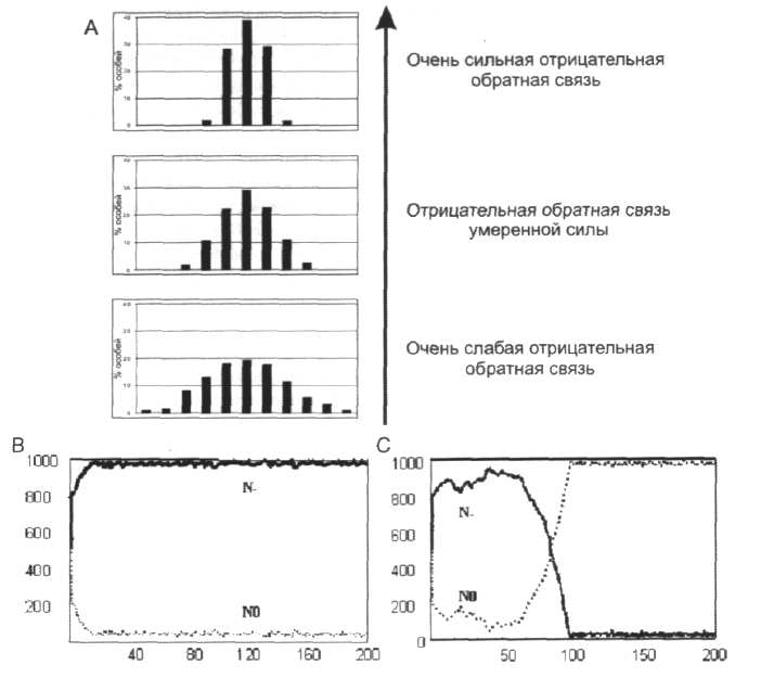 Рис. 15. Роль отрицательных и положительных обратных связей в эволюции (см. текст). А — Качественная картина «обнейтраливания» мутационного спектра под действием отрицательной обратной связи (по оси х — спектр фенотипической изменчивости, по оси у — частота особей определенного фенотипического класса) (Колчанов, 2003). В, С — конкуренция особей с отрицательной обратной связью (N-) и без нее (N0) в ходе эволюции популяции под действием стабилизирующего отбора (В) и под действием движущего отбора (С) (Колчанов, Шиндялов, 1991). По оси х отложено количество эволюционных шагов, по оси у — число особей (численность популяции постоянна — 1000 особей). В начальный момент 50% особей имеют контур с отрицательной обратной связью (N-) и 50% особей не имеют такого контура (N0) (Колчанов, Шиндялов, 1991).