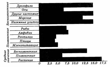 Рис. 44. Генетическая изменчивость в природных популяциях различных групп организмов (Айала, 1981, с. 48). По оси абсцисс - процент гетерози-готных локусов на одну особь; по оси ординат - группы организмов