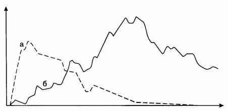 Рис. 45. Смена доминирующих таксонов в имитационной компьютерной модели, а, б - модельные таксоны. По оси ординат - число родов в модельном таксоне, по оси абсцисс — время, усл. ед. Прочие пояснения см. в тексте