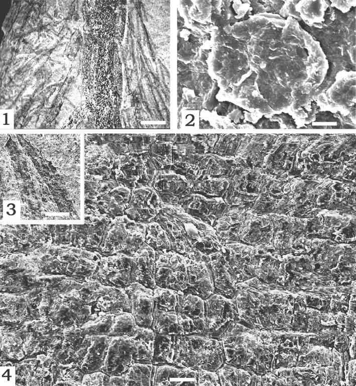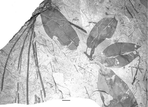 Листовые остатки представлены несколькими типами сложных листьев, редко встречающихся у современных мангров. Однако конфигурация радиально расходяшихся пальчатых листочков аналогична таковой у биюгатных листьев современных мангров (Thomlinson, 1994), связанной с дефицитом света в мангровых зарослях. Развитие крупных солевых желёзок (рис. 4) подтверждает принадлежность листовых остатков мангровой растительности.