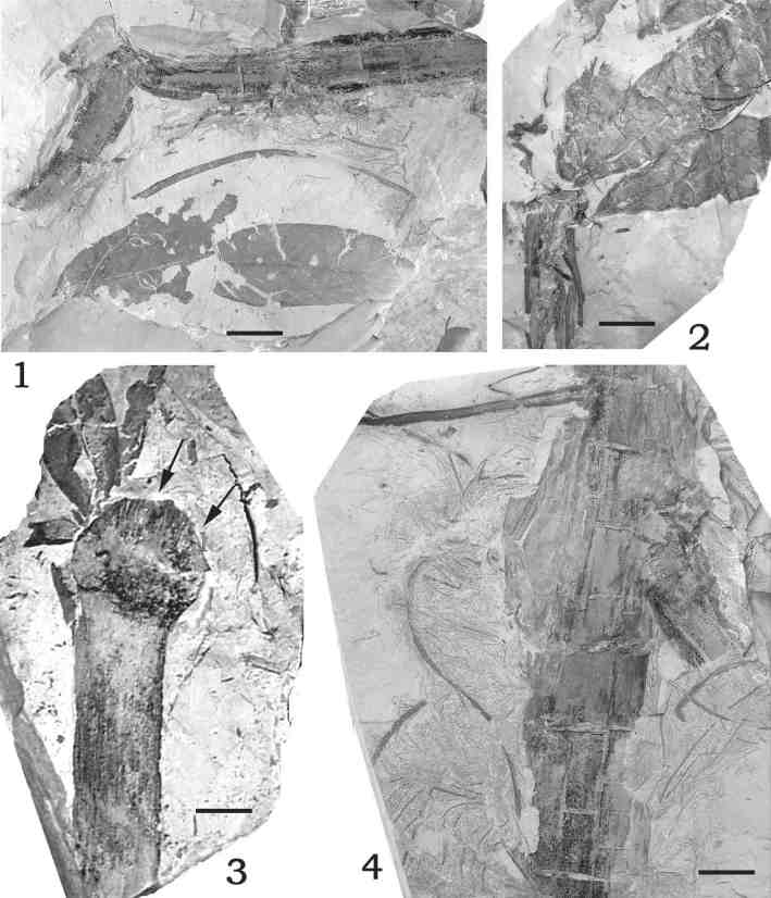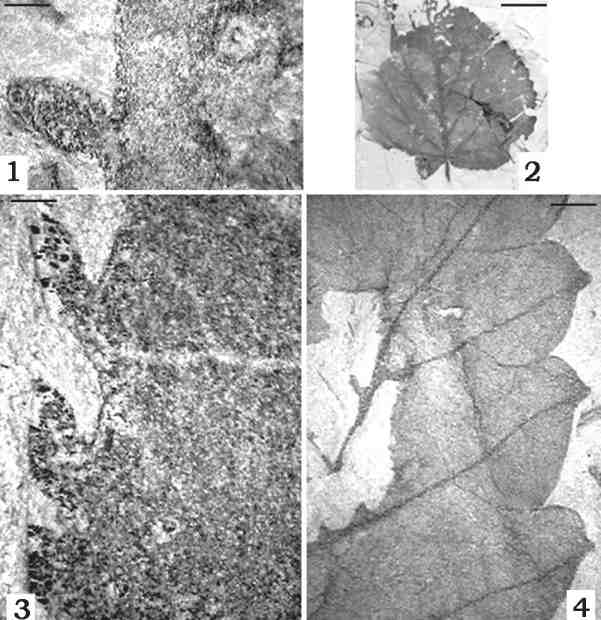 Рис. 9. Герофит, сходство краевых галлов (1, 3) и регулярной краевой зубчатости листьев (2, 4), впервые появляющихся на данном стратиграфическом уровне. Масштабная линейка1.8 мм (1, 3, 4), 20 мм (2).
