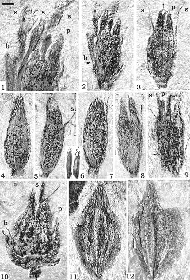 Рис. 6. Герофит, цветки и плоды мангровых растений из предковой группы современных семейств Combretaceae, Rhizophoraceae и Myrtaceae: (1, 2) цветки с гетероморфными пластинчатыми лопастями лепестков и чашелистиков, выступающими над гипантием; (3) цветок с волосовидными свободными лопастями чашелистиков и пластинчатыми лепестками; (4, 5, 7) цветки с приросшей брактеолью и сцепленными в почке волосками лепестков; (6) такие же верхушечные волоски на лепестках современной Bruguiera; (9, 10) цветки с каудатными чашелистиками и лопастной брактеолью в основании; (1б 12) крылатые плоды той же группы растений (b – брактеоль, p – лепесток, s – чашелистик). Масштабная линейка 0.6 мм (1), 0.8 мм (2 – 8), 1.1 мм (9 – 11).