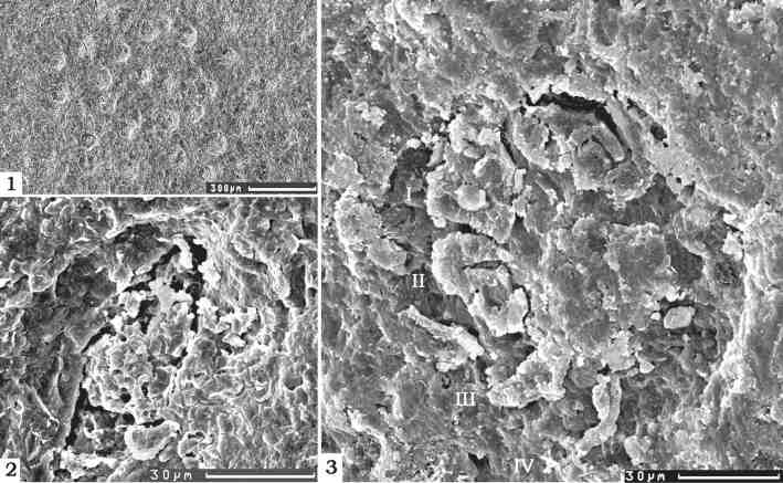 Рис. 7. Герофит, клещевые галлы, СЭМ: (1) группа из 12 галлов; (2) пучки питательных волосков внутри галла; (3) экзувий внутри галла, обозначены четыре пары конечностей.
