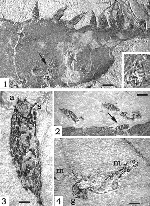 Рис. 8. Герофит, листовые галлы и мины насекомых: (1) галлы на краю и нижней поверхности листовой пластинки; стрелкой отмечена вгрызающаяся в лист личинка, показанная с увеличением на врезке; (2) галлы, отделившеся от края листа; стрелкой отмечена личинка, обрастающая краевым галлом; (3) отделившийся галл, видны выступающие из выходного отверстия антенны (a) и передние щетинки (s) экзувия куколки; (4) редкий случай ассоциации мины и галла: мина (m), делающая петлю и возвращающаяся в галл (g). Масштабная линейка 2.2 мм (1), 1 мм (2), 0.8 мм (3), 0.6 мм (4).