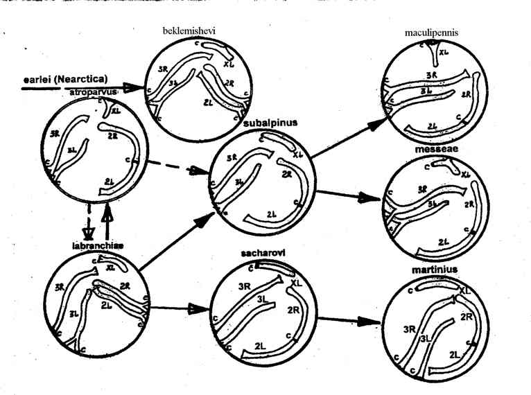 Рис.1. Схема эволюционного изменения архитектуры политенных хромосом трофоцитов яичников восьми видов малярийных комаров палеарктического комплекса Anopheles maculipennis. Стрелками показаны направления видообразования (сплошными - наиболее вероятные, пунктирными - менее вероятные).