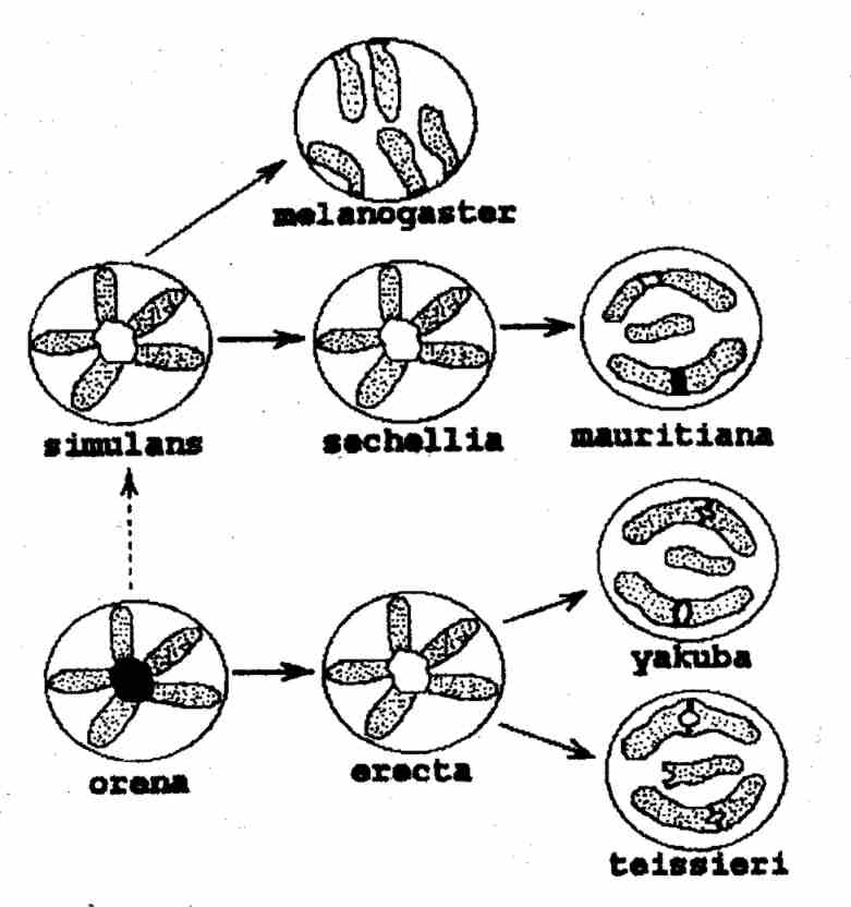 Рис.2. Схема эволюционного изменения архитектуры первично политенных хромосом трофоцитов яичников восьми видов комплекса Drosophila melanogaster. Стрелками показаны направления видообразования, основанные на комплексных данных [14]