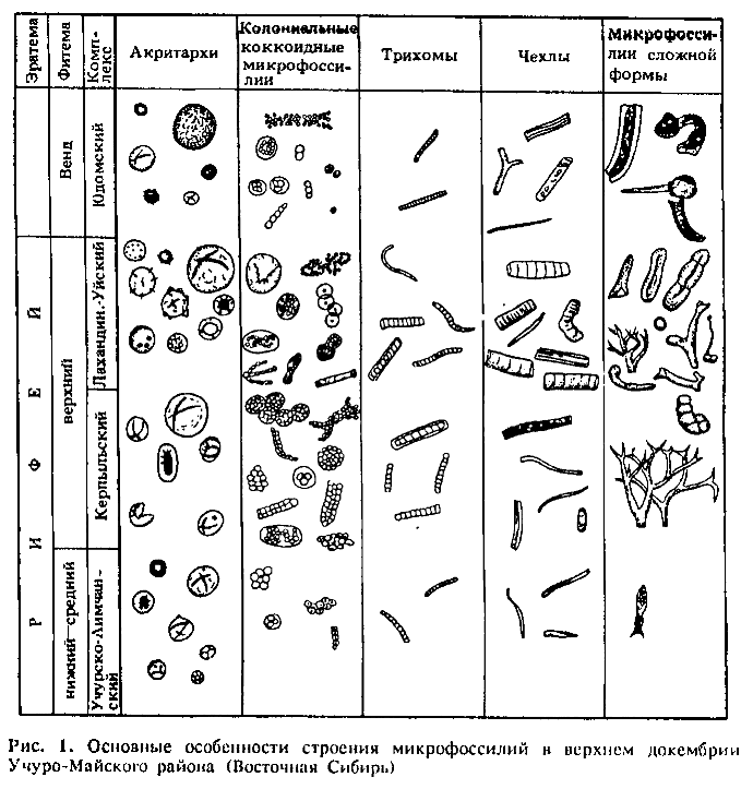 Докембрийские органостенные микрофоссилии (ОМ) — представляют собой большую группу крайне гетерогенных по своим биологическим связям ископаемых микроорганизмов. В количественном отношении среди них резко преобладают (3/4 всех известных ОМ) остатки двух основных морфологических типов — сфероморфных (коккоидных) и нитчатых. Помимо этих двух типов, варьирующих по размерам и второстепенным особенностям строения в широких пределах, в отложениях различного возраста известны полигональные, овально-эллипсоидальные, кольцевидные, клубковидные, сферические, спиральные, членистые, конические, цепочечные, кусти-ковидные и некоторые другие разновидности ОМ. Среди них с разной степенью достоверности идентифицированы представители главных подразделений живого мира — прокариот и эукариот: бактерии, низшие грибы, одно- и многоклеточные водоросли и, возможно, животные/ В своей совокупности они соответствуют всем необходимым компонентам замкнутой трофической цепи, что свидетельствует о высоком уровне стабильности и эволюционной продвинутости верхнепротерозойских биоценозов. Единственным общим признаком, объединяющим все эти резко разнородные микроископаемые, является наличие в состава их защитных и опорных структур (клеточных стенок, чехлов, оболочек) различных высокостойких углеводородных соединений — полисахаридных, гликопептидных и других комплексов, что и позволило им фоссилизироваться в определенных специфических условиях.