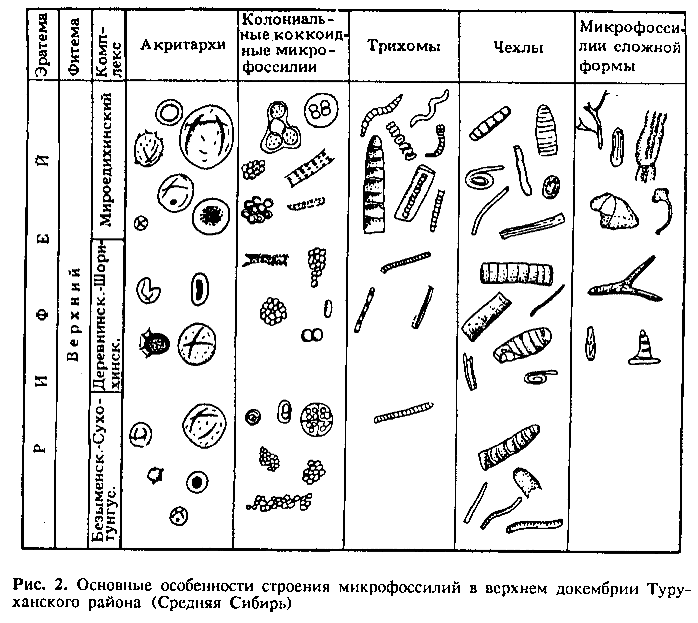 Таким образом, микробиоты докембрийских ОМ включают очень широкую выборку ископаемых микроорганизмов, в которую входят (примерно в равных соотношениях) представители всех их главных докембрийских морфологических и экологических группировок. Среди остатков предположительно эукариотных организмов могут быть названы планктонные (крупные акритархи и их ценобиальные агрегаты) и бентосные (талломы метафитных водорослей, трубчатые ребристые покровные структуры, возможно, животного происхождения) формы, грибоподобные сочетания оболочек и связанные с ними репродуктивные образования. ОМ, которые интерпретируются как прокариотные микроорганизмы, обнаруживают близость к различным коккоидным и нитчатым цианобактериям и также включают планктонных и бентосных представителей. К первым можно отнести многочисленные небольшие по размерам фрагменты колоний и их скопления, состоящие из коккойдных клеток, и широко распространенные остатки разобщенных трихомов и чехлов, а ко вторым — протяженные многослойные слоевища, состоящие из многих сотен клеток.