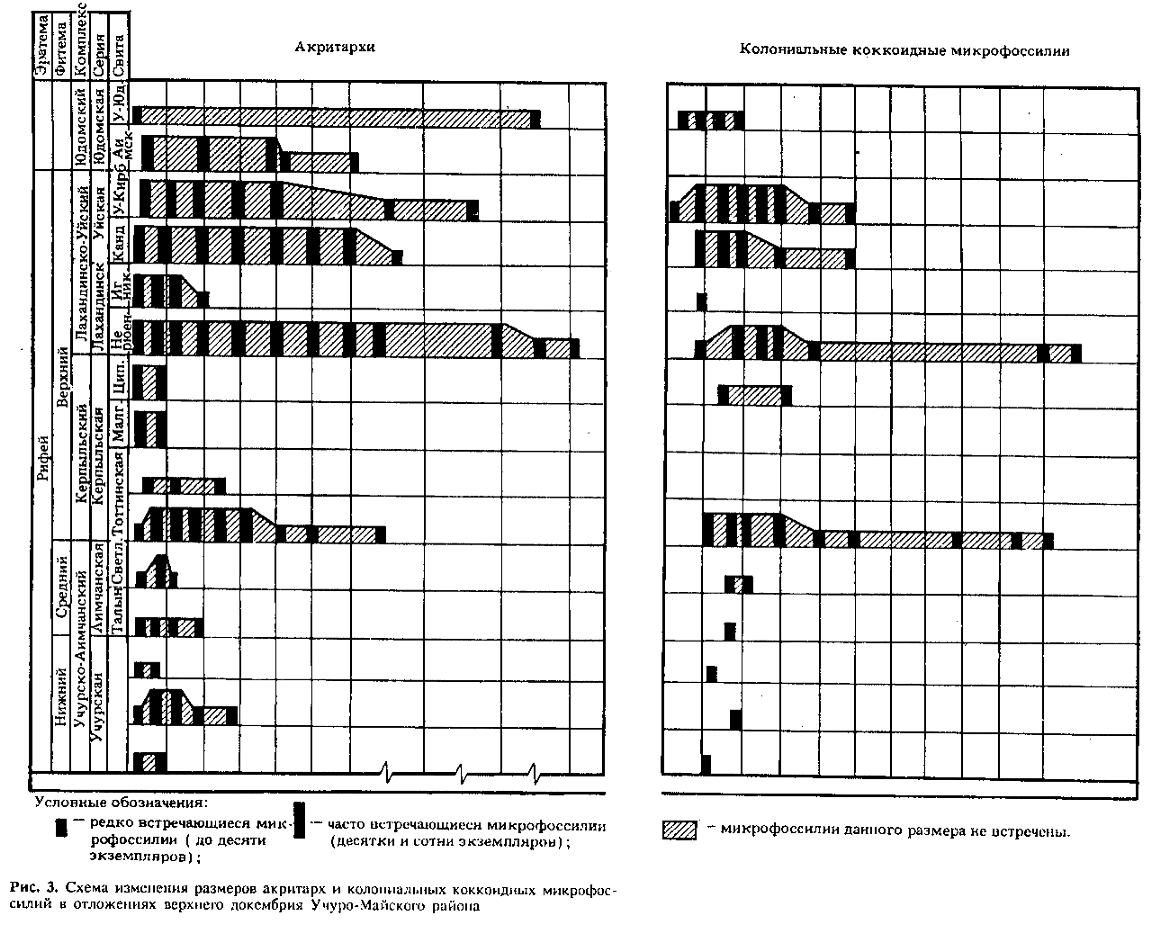 Возможность объективной оценки главных особенностей развития древних микроорганизмов, представленных ОМ, предполагает наличие непротиворечивой схемы временной последовательности их морфотипов. Очевидно, что такая схема не может основываться лишь на теоретических построениях, а должна отвечать совокупности данных о реально наблюдаемом распределении ископаемых в разновозрастных отложениях докембрия. Последнее обстоятельство представляет собой наибольшую трудность в связи с тем, что в общих схемах расчленения докембрия возраст одних и тех же толщ трактуется по-разному. Кроме того, имеются резко несовпадающие оценки биологического значения одних и тех же зафиксированных возрастных изменений ассоциаций ОМ (эволюционная последовательность — Schopf, 1977; количественное перераспределение морфотипов — Knoll, 1982, 1984).