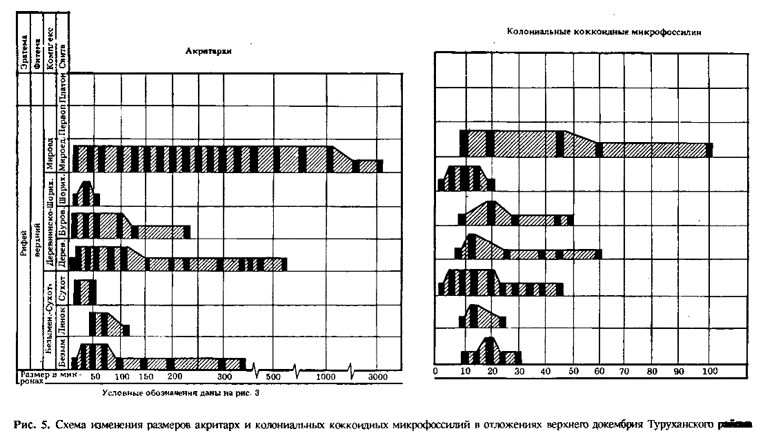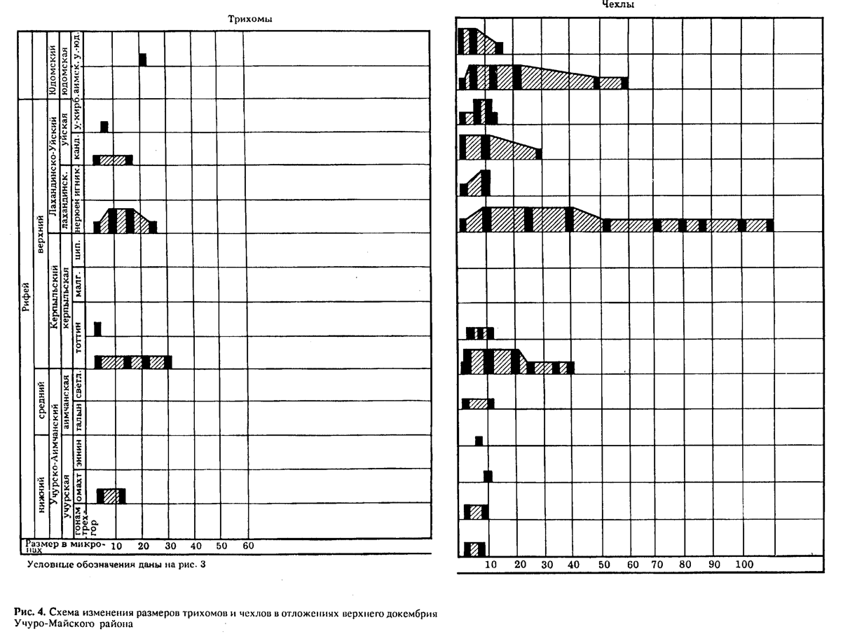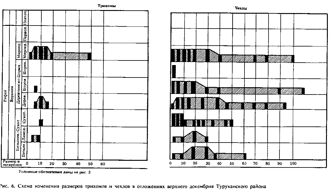 Наиболее представительные ассоциации ОМ приурочены к нижним и средним горизонтам среднего рифея (каратавия). Рядом исследователей это прямо связывается со временем максимального процветания рассматриваемых микроорганизмов (Тимофеев, 1979; Янкаускас, 1982; Vidal, Knoll, 1982 и др.). На этом же рубеже резко возрастает систематическое разнообразие ОМ во всех их морфологических группировках, увеличиваются предельные размеры большинства морфотипов, отмечаются существенное усложнение морфологии (появляются акантоморфные акритархи Trachyhystrichosphaera, гигантские Chuaria, нитчатые Taenitrichoides, Rugosoopsis, Rectia, талломы Ulophyton, многочисленные грибоподобные образования). Особенно важным обстоятельством, подчеркивающим биостратиграфическое значение названных изменений рифейских ОМ, является то, что они зафиксированы во всех главных районах развития рассматриваемых отложений в тех их разрезах, в которых обнаружены достаточно полные региональные последовательности ОМ (Южный Урал, Учуро-Майский регион, Туруханский район, Енисейский кряж и т. д.) (рис. 1—6). Сравнение таких полных последовательностей показывает, что для них характерны однотипные изменения ОМ, заключающиеся в существенном увеличении их предельных размеров и усложнении строения вверх по разрезу рифея. Оба эти процесса находят свое отображение в существенном расширении систематического разнообразия рифейских ОМ (Вейс, 1988). Одно из возможных объяснений отмеченных изменений ОМ связано с фундаментальными биологическими свойствами древнейших микроорганизмов. Большая часть ОМ представляет собой остатки фототрофных одно-и многоклеточных планктонных и бентосных форм. До появления эукариотной организации развитие таких организмов шло по пути рационализации фотосинтеза. После возникновения ядра, оптимизации набора пигментов и структуры фотосинтезирующего аппарата, в дальнейшей их эволюции оставалась только одна важная неиспользованная возможность — увеличение площади фотосинтезирующей поверхности, что и нашло, по-видимому, свое отражение в преобразованиях, наблюдаемых у ОМ. В этом же направлении, вероятно, действовал и стабилизирующий отбор, поддерживающий равновесие фитопланктона и планктонных консументов (Бурзин, 1987).