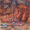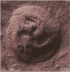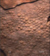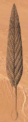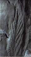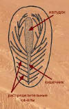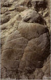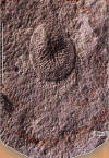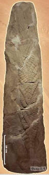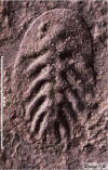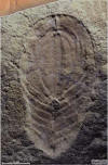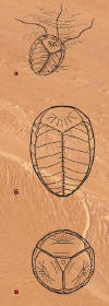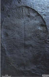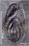 Фото 13. Археаспис (поздний венд; Архангельская обл., Зимние горы). Фото 14. Андива (поздний венд; Архангельская обл., Зимние горы). Фото 15. Вендия соколова (поздний венд; Архангельская обл., скважина Яренск). Фото 16. Паравендия яна (поздний венд; Архангельская обл., Зимние горы). Фото 17. Отпечаток кимбереллы (поздний венд; Архангельская обл., Зимние горы). Реконструкция кимбереллы в виде моллюскоподобного существа, имевшего колпачковидную раковину и широкую, гофрированную по краям, мантию. Фото 18. Отпечаток кимбереллы со следами питания (поздний венд; Архангельская обл., Зимние горы). Фото 19. Отпечаток трех кимберелл и следов, оставленных ими под поверхностью осадка. Такие следы свидетельствуют о наличии у кимбереллы мощной мускулатуры и, возможно, специального органа для передвижения, вроде ноги гастропод (поздний венд; Архангельская обл., Летний берег Белого моря). Фото 20. Солза. Загадочное билатеральное ископаемое, все тело которого пронизывала частая сеть ветвящихся каналов пищеварительной (?) системы. Веер тонких валиков, в центре которого лежит отпечаток — следы питания кимбереллы (поздний венд; Архангельская обл., Летний берег Белого моря). Фото 21. Чарния. Перовидная чарния вела прикрепленный образ жизни. Полный отпечаток (нижняя часть восстановлена) (поздний венд; Архангельская обл., Зимние горы). Фото 22. Чарния, деталь того же отпечатка, что и на фото 21. Чарния (реконструкция) Фото 23. Отпечаток прикрепительного диска петалонамы (поздний венд; Архангельская обл., Зимние горы). Фото 24. Вентогирус (поздний венд; Архангельская обл., р. Онега). Реконструкция вентогируса. а — внешний вид, б — сбоку, в — сверху. Обрыв зеленоцветных песчано-глинистых отложений позднего венда. Раскопом вскрыт тонкий слой песчаника, содержащий отпечатки вендских многоклеточных (Архангельская обл., Летний берег Белого моря). |