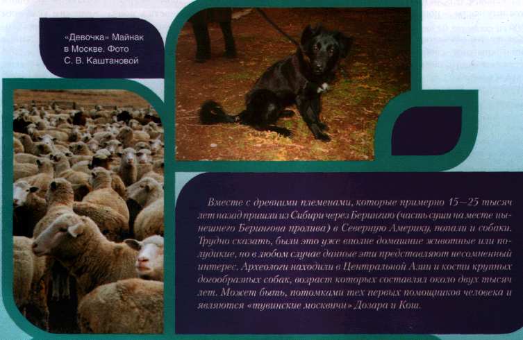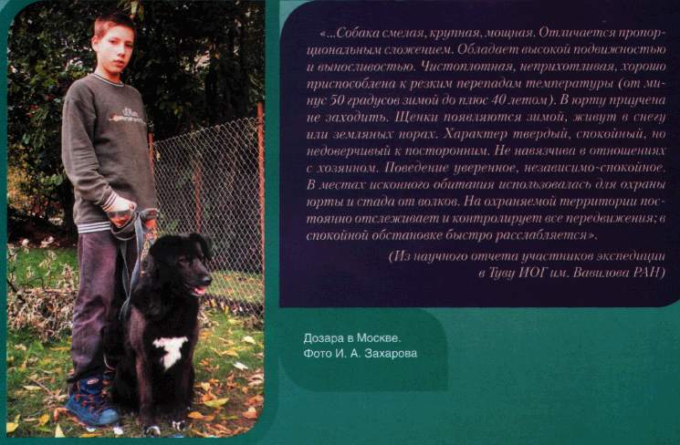 Каково же было наше удивление, когда в трудно доступных горных районах Тувы мы встретились с собаками неизвестной породы (точнее, породной группы или местной популяции). Заинтересовавшись, занялись сбором сведений о тувинской собаке. Поскольку оказалось, что на сегодняшний день сохранилось буквально считанное количество животных этой породы, сделали все (создали прямо при нашем институте в Москве питомник «Монгун-тайга») для того, чтобы сохранить ее генофонд.